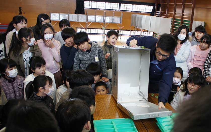 投票が一段落した後、選挙クイズ形式で「投票用紙はどんな材料でできているか」との質問が出た。正解は意外にも「プラスチック」。「へぇー!」の声に、選管の岩田さんは「丈夫で折り曲げても戻りやすく、機械で数えやすいからだよ」。「開票したら同数になった。さあて、どうする?」 再選挙など三択の正解は「くじ引き」。これまた「へぇー」。驚きが重なって、ワイワイガヤガヤの声が一層大きくなった。