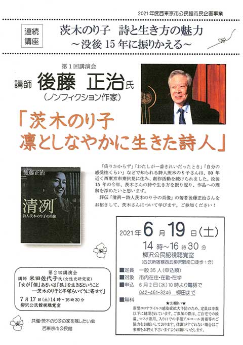 東伏見に50年近く住み続けた詩人、茨木のり子さんについて、お二人の講師から学びます。