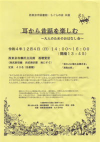 今は、テレビ・映画・インターネット・ゲームなど、たくさんの情報や娯楽がありますが、活動の中で、子どもたちは、耳から聞くおはなしをとても楽しんでくれていることを感じています。大人の方も、この機会におはなしを楽しんでみませんか?