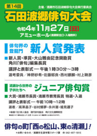 本年は小中学生を対象とした「ジュニア俳句賞」、今後の活躍が期待される若手俳人を対象とした「石田波郷新人賞」を設け、各部門の入選作品の講評と表彰式を行います。主催は「清瀬市石田波郷俳句大会実行委員会」です。(清瀬市HPから)
