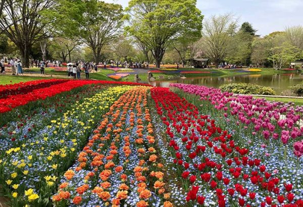 目の雨に広がる色鮮やかな花々に圧倒された。国営昭和記念公園(立川市・昭島市)のチューリップが見ごろを迎えている。小平市から五日市街道を車で約40分。園内のレンタサイクルで緑の中を走って、公園中央にある渓流広場の「チューリップ・ガーデン」へ。242品種22万球という花々が池を囲むゆるやかな斜面に咲き誇っていた。(写真は、見ごろを迎えるチューリップ。4月13日午後0時45分)