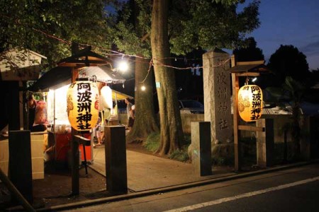 鎮守の森のたたずまいを残す西東京市新町の阿波洲(あわしま)神社境内で、恒例の豊年民踊大会が[2015年]9月12日(土)と13日(日)の2日間開かれた。好天に恵まれた両夜とも近所の親子連れなど大勢の人たちで賑わった。