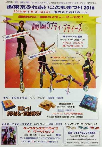 1月最後の日曜日31日に、「西東京ふれあいこどもまつり2016」が、保谷こもれびホールオープンデ―参加企画として行われた。 プログラムは3本。午前中にワークショップ「世界に一つ!オリジナルキューブパズルを作ろう!」、お昼休みに「タップダンスミニライブ&ワークショップ」、メインイベントは午後の「Witty Lookのプティ・ブティーズ」。 作ったり描いたりするのが好きな子も、身体を動かすのが得意な子も、見るのが楽しい子も、もちろん大人も、保谷こもれびホールに行けば、朝10時から夕方4時までのどこかで好みのプログラムに参加できる仕掛けだ。言うまでもなく3本全部に参加することもできる。