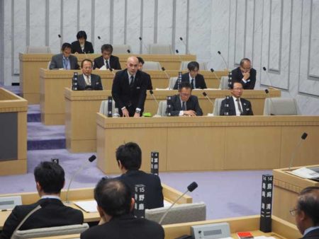 東久留米市議会は[2017年]3月29日に臨時議会を開き、4月1日から6月30日までに必要な経費を盛り込んだ2017年度一般会計暫定予算案を賛成多数で可決した。暫定予算案は、27日の第1回定例会で一般会計予算案が否決されたことを受けて市から上程された。(写真は、臨時議会で質疑に答える並木克巳市長=東久留米市議会)