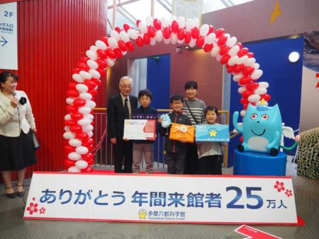 西東京市芝久保町にある多摩六都科学館の来館者が[2017年]3月30日、年間過去最高の25万人を達成し、記念すべき来館者に記念品が贈呈された。(写真は、右から3人目が北山周生君。家族、高柳雄一館長らと記念撮影)