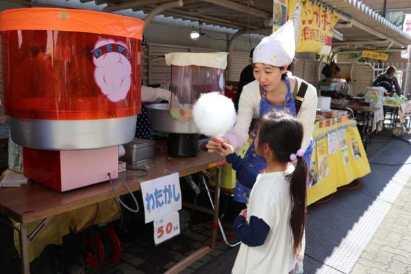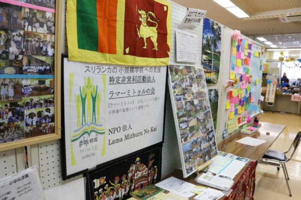 主会場となった谷戸公民館は体育館の隣。入り口前の広場には焼きそばや綿菓子、スーパーボールすくいなどの出店が並ぶ。シンガポールやスリランカの料理を求める人もいた。親子連れが丸テーブルで食べたり飲んだりして、午後のひとときを楽しんでいた。