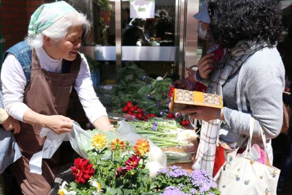 玄関脇で地元野菜と花を販売していたのは西東京市地産地育会のメンバー。採れたてのカブやキャベツ、ネギなどが並び、野菜の結束テープに西東京市農産物キャラクターの「めぐみちゃん」マークがくっきり。買い手が次々にやって来る。副会長の奥田明子さんは「農家と市民が協力して、地元の農業と緑を守ろうと活動しています」と話していた。