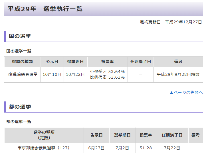 ・平成29年選挙執行一覧 都の選挙(東京都選挙管理委員会事務局)
