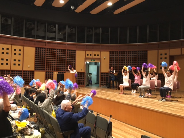 続いて、利用者が練習を重ねてきた体操を来場した家族らと一緒にお披露目。応援で使うポンポンをもって、「みんながみんな英雄」の音楽に合わせ、椅子に座ったまま、手を前後左右に大きく回し筋肉をほぐして体を温めた。