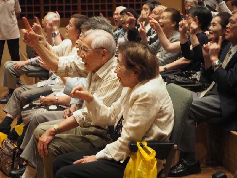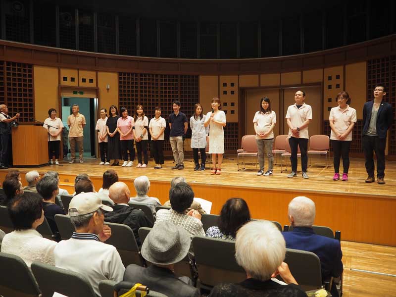 また、脳トレで韓国語を学ぶ代表者7人が、舞台に上がり韓国民謡の「アリラン」などを合唱。さらに利用者のピアノ伴奏に合わせ、職員がフルートで「夕焼け小焼け」などを奏でた。