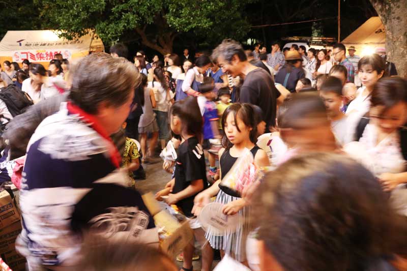 やがて子どもたちにお菓子が配られる時間。菓子箱を抱える役員らの周りに人垣が出来た。しかし事前に「十分数があるので安心してください」とアナウンスが流れていたこともあって動きはスムーズ。お菓子を手にした子どもたちはあっという間に散らばった。