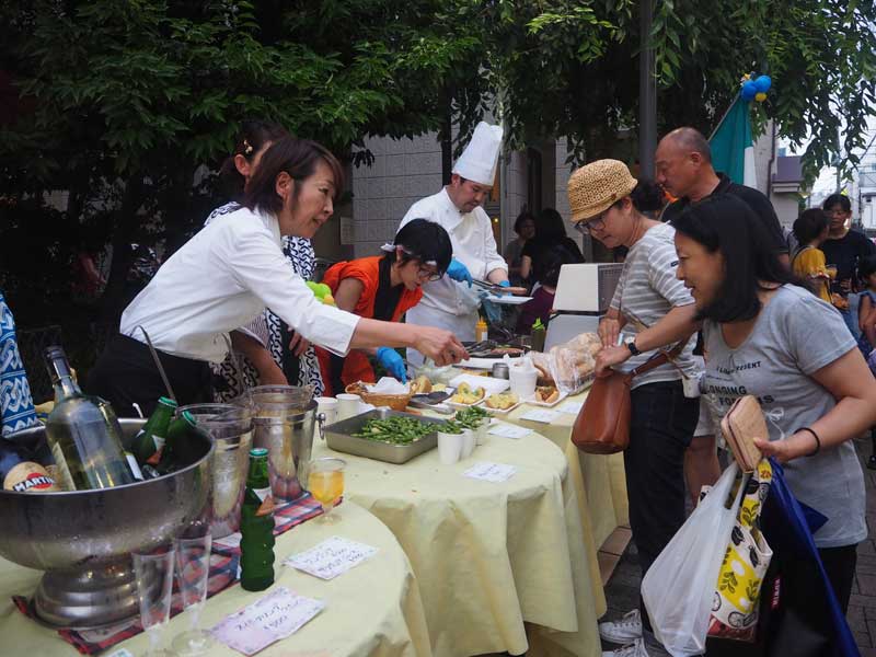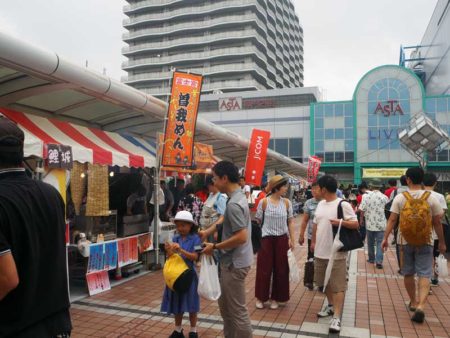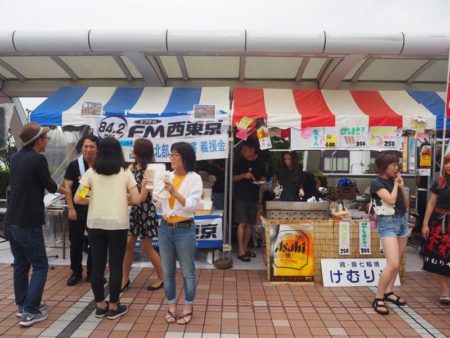 デッキには、地元飲食店などによる炭火焼き鳥や一口コロッケ、生ビールにかき氷などの模擬店約20店舗が並んだ。その内、地元のコミュニラジオ局エフエム西東京のブースでは、九州北部豪雨の被災地への義援金を集めるチャリティーグッズを販売していた。製品は医療用純度の脱脂綿とガーゼで作られた身体に安全なハンカチ。ミニステージでは、キッズダンスやバトンチームによる演技などが披露され、観衆からは大きな声援があがった。