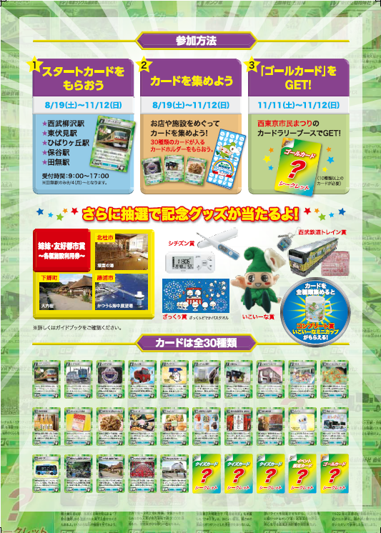 用意されたカードは全30種類。市の名所やグルメなどの写真と説明が載っている。カードでは得点を競うゲームもできる。10種類以上集めると、11月11日㈯と12日㈰、西東京いこいの森公園で実施される「西東京市民まつり」で、キラキラのゴールドカードがもらえる。その上、抽選で、姉妹都市[の福島県]下郷町大内宿の民宿宿泊利用券1万円分が3人に当たるなど豪華な賞品も用意されている。また、30種類全部集めると、同市マスコットキャラクターがデザインされた「いこいーなミニカップ」が400人にプレゼントされる。