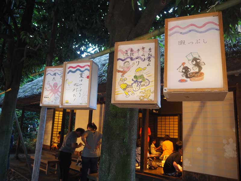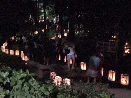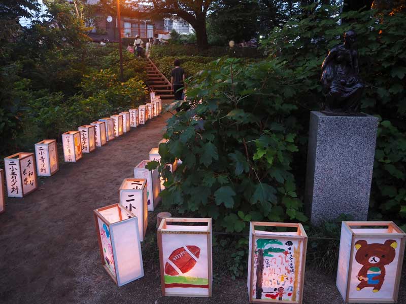 小平市に古くから伝わる地口行燈を伝承する「小平グリーンロード灯りまつり」が8月5日夕暮れから、市内狭山・境緑道沿いの公園や広場を中心に開かれた。今回で12回目。市民らが手作りした燈籠やペットボトルで作った燈籠約9000基が温かい灯りで通りを包み込んだ。