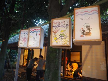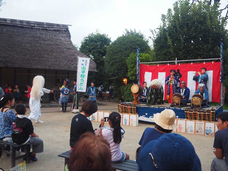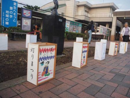 当日午後6時30分、各会場に一斉に灯りがともされた。花小金井駅南口を降りると、赤色と青色の波線が描かれた本職の作品や子どもたちが作製した燈籠が並んでいた。小平ふるさと村では、燈籠を前に市の無形民俗文化財に指定されている鈴木ばやしの定期演奏会があった。また手打ちの小平糧うどんも提供され、来場者は燈籠の灯りを眺めながら舌鼓をうっていた。