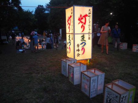 天神町じゃぶじゃぶ公園では、地元の秀峰会自治会が、高低差がある公園の地形を利用して燈籠を並べ、祭りのムードを盛り上げていた。