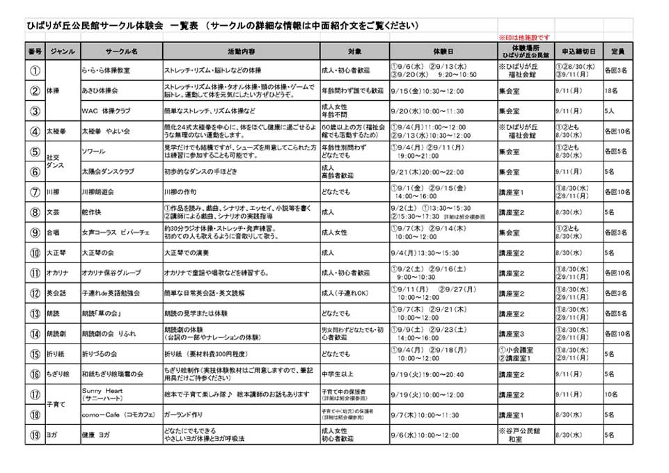 西東京市だけでなく近隣市住民も参加可。各サークルの受入日や人数など詳細はひばりが丘公民館(電話042-424-3011)にあるチラシやパンフレットを参照。西東京市のWebサイトにも掲載(下記の関連リンク参照)。希望者は8月30日(水)までに同館に電話かメールで申し込む。9月15日~30日の参加申し込みは9月11日(月)まで受け付ける。