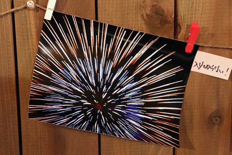 なかでも、花火を大写した1枚がひときわ印象的だった。撮影した池田努さん(49)は店主の大久保さんとは20年来の付き合い。今年4月に購入した一眼レフを持参して初めて花火撮影に出かけた。「尺五寸(直径約45cm)の花火が打ち上げられるというので、青梅市の花火大会に出かけて撮りました。花火が大きすぎて画面に入りきらなかった」と悔やむ。