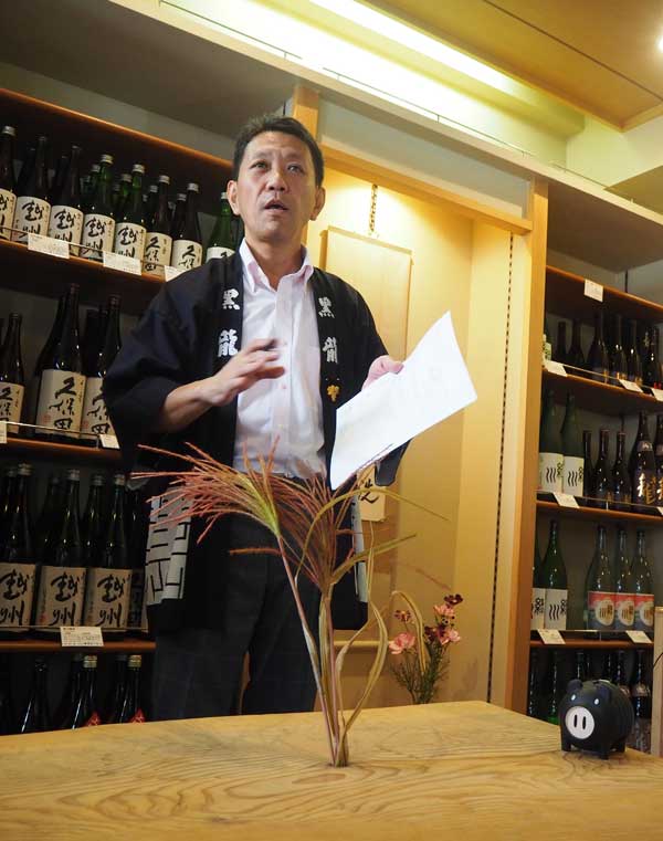 ゼミナール当日、鶴田さんが日本酒造りの工程などを説明した。「日本酒は四季に合った種類と飲み方があり、世界でも珍しい四季を感じられるお酒です」と話し、店主一番押しの秋が旬の「ひやおろし」について解説した。