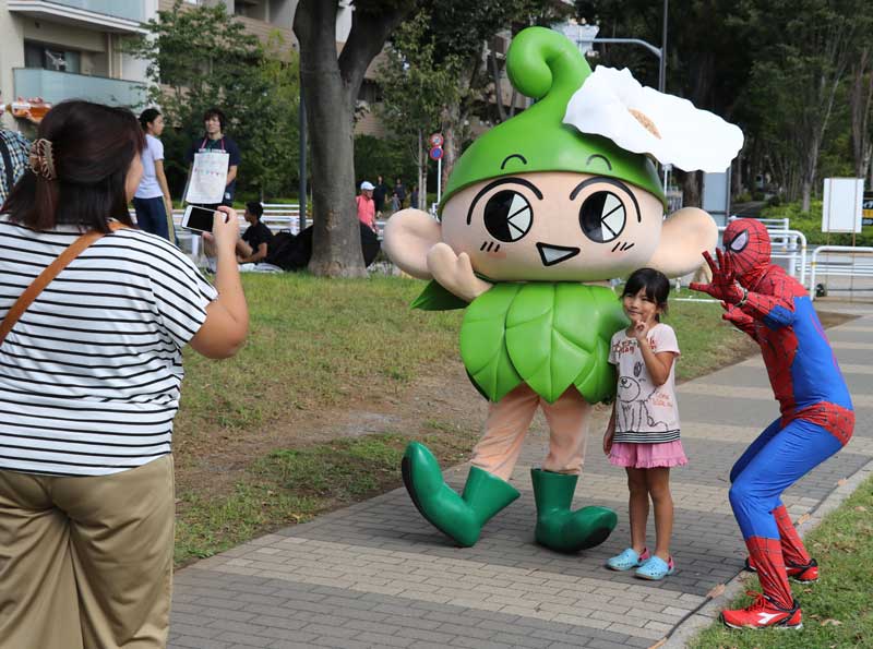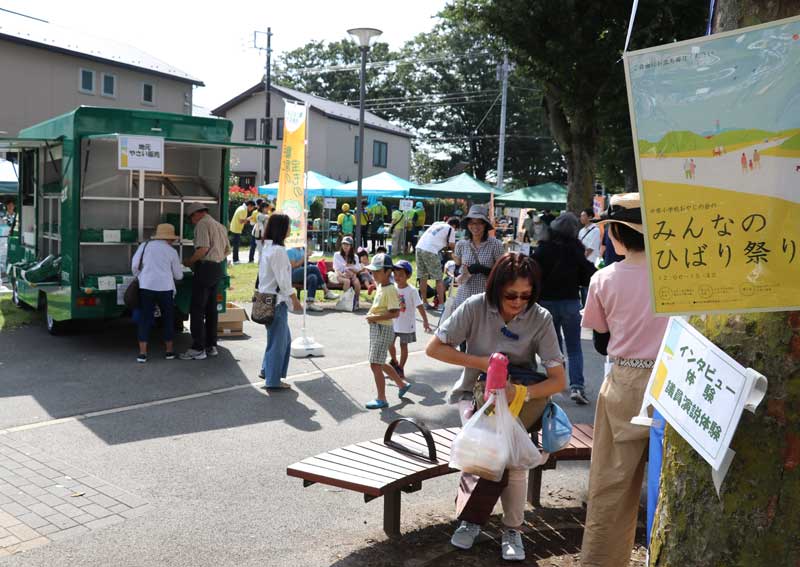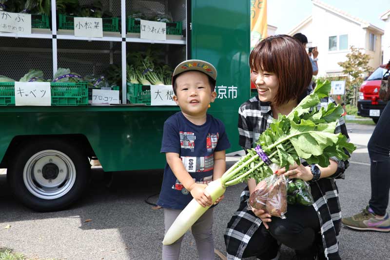 列が出来たのは、採れたて野菜のファームカー販売だった。地元産のカブ、キャベツ、大根などが並ぶ。近くのマンション街からやって来た渡部悠さん(29)は子どもと一緒。大根のほか、サツマイモやピーマンなどを袋いっぱい手に入れた。「ちらしが入っていたのでこの催しを知りました。お祭は楽しいですね」。