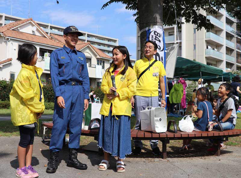 公園でも体験会が開かれた。レポーターの取材体験では、5年生女子の2人が新人消防士にインタビュー。そのあと演説体験会にも参加し、「市長候補」の演説までやってのけた。父親たちの仕事と職業の一端を経験する試みに、周りから拍手が湧いた。
