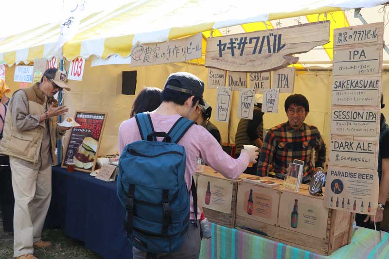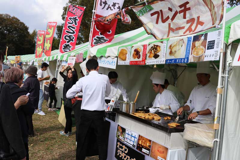 公園中央の出店エリアに170を超えるテントが並んだ。市内のレストラン、食堂、料理店などが集まり、商店会や建設系会社も焼きそばやビールなどを振る舞っていた。呼び込みの声が飛び交い、顔見知りがあちこちで談笑する光景も見られた。