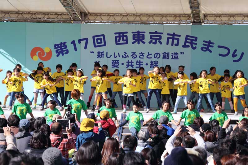 第17回西東京市民まつりが[2017年]11月11日と12日、市内緑町のいこいの森公園で開かれた。晴天に恵まれた2日間、市内外から15万人(主催者集計)が集まり、商店や団体の出店を訪れ、野外ステージや路上のパフォーマンスを見物したり応援したり。大がかりなまつりのひとときを楽しんだ。