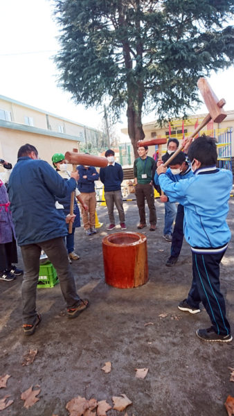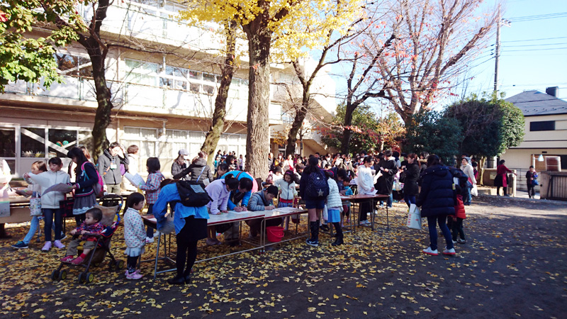 校内ではあわせて、同小通域ふれあい会などが主催する餅つき大会も実施。つきたての餅が味わえるとあって、長い列ができた。訓練との合同開催は3度目となる。