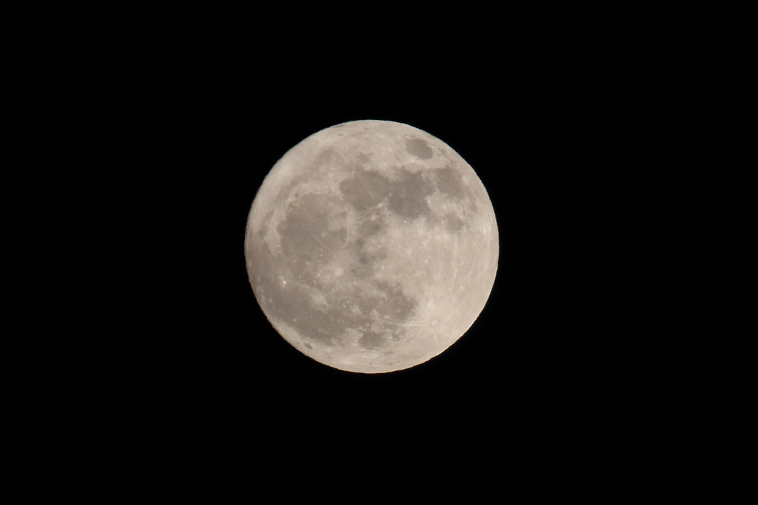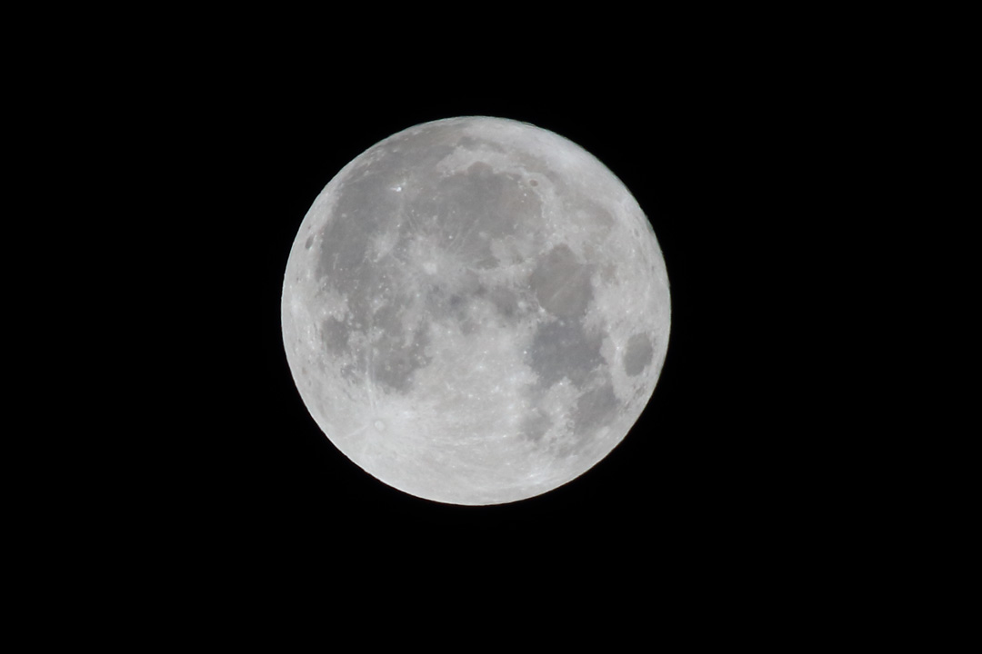 その夜、子どもたちが久しぶりに顔を揃えてアルコールと馬鹿話に花が咲く。あいや、満月を取り逃がしそうではないか。あわてて道具を揃え、屋上に出た。晴れた夜空に星がまぶしい。それ以上に、満月が神々しい。月はすでに天頂に近い。時刻は4日午前零時半を回っていた。それから半刻。あーでもない、こーでもないと設定をいじって、最後はF値8、ISO400、シャッター速度は1/800秒にして撮影した。