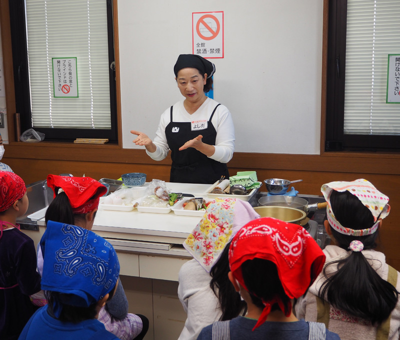 当日の午後、同地区会館の調理実習室では、エプロン・三角巾を付けて身支度を整えた子どもたちが、管理栄養士でキッズキッチンインストラクターの吉田朋子さんから、包丁やまな板の使い方、昆布とかつお節の合わせだしの取り方や調理の仕方などを教わった。