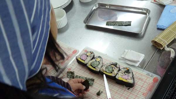 内裏様の顔にはチーズかまぼこを使う。本体は緑とピンクの寿司飯。卵焼きを台座に見立て、焼き海苔で包んだニンジンや野沢菜を飾り付ける。巻き簀を使って太巻きに。包丁を入れると、切り口から内裏様が表れた。細かく切った海苔を頭部に張り付けて出来上がり。内裏様は髪が長かったり眼が丸かったり表情が豊か。女雛に「ピアスを付けた!」という子もいた。