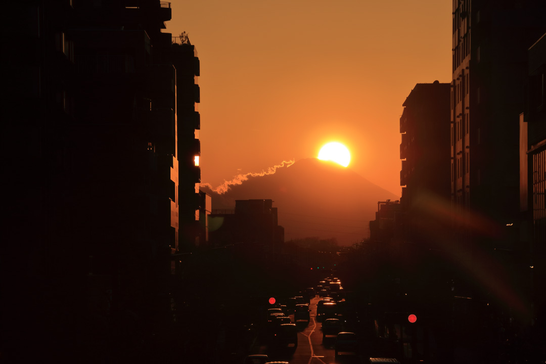 ダイヤモンドのように輝くのは冬至の前後1週間(12月18日~25日)とされる。しかし撮影は[2017年]12月27日と29日夕。ダイヤモンドの光輝が、山頂から微妙にずれるのもまた奥ゆかしい。
