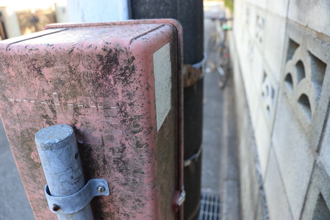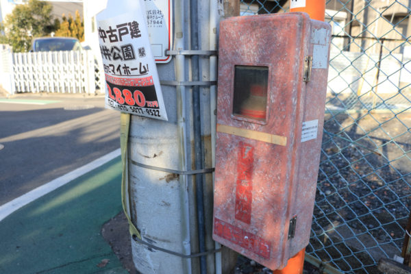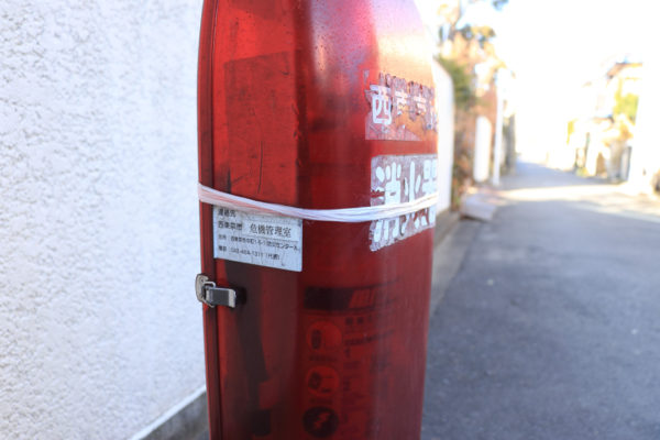 泉町5丁目の消火器は、根元の鉄柱が曲がっている。車にでもぶつけられたのだろうか。扉を開けたら転がり落ちそうに傾いていた。