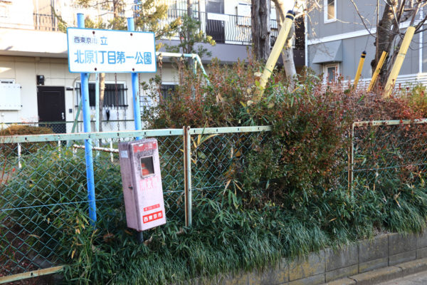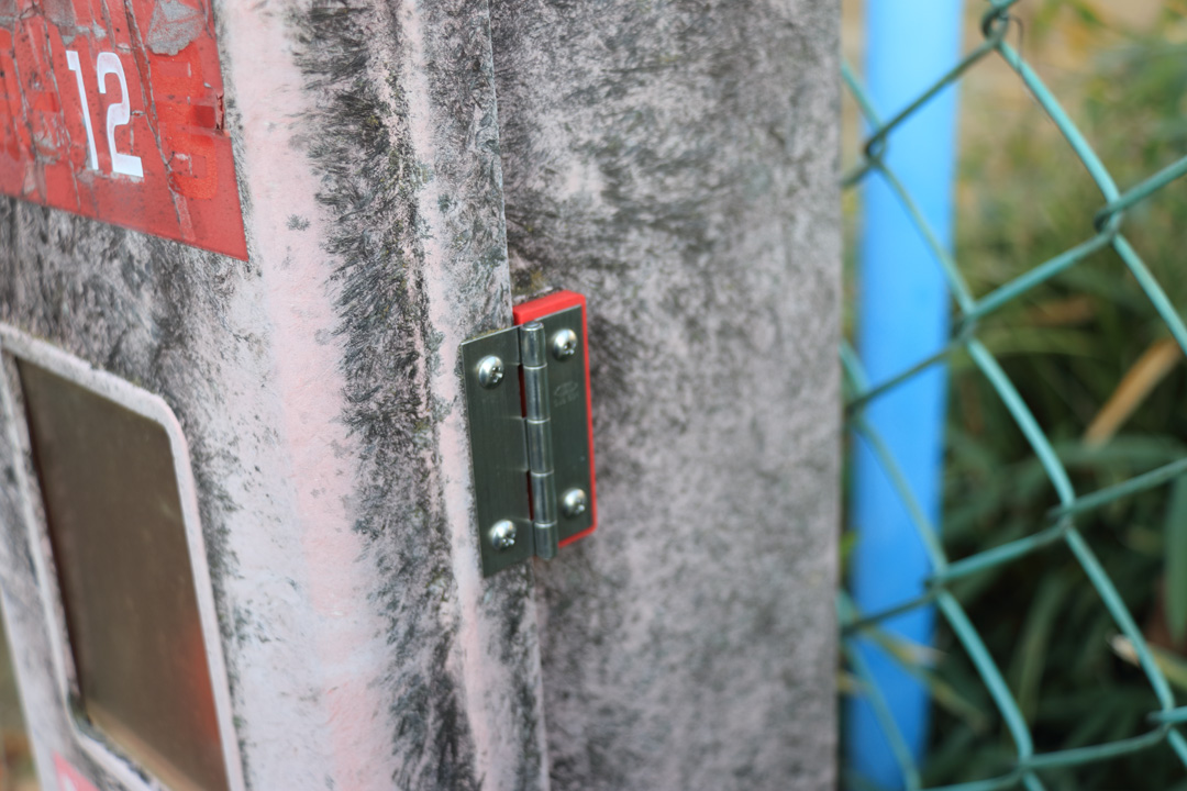 外側のケースは古いが、パッドを挟んで金具を締め直し、扉の破損が修理されているのもある。北町1丁目公園の消火器は傾いたままでも、扉の蝶番は真新しいパッドでしっかり止められていた。