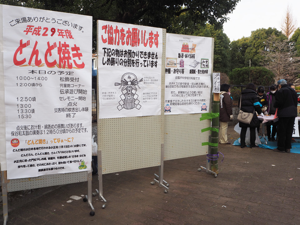 正月に飾った門松やしめ縄などを持ち寄ってお焚き上げをする「どんど焼き」が [2018年] 1月8日、西東京市立明保中学校の校庭で実施された。点火と同時に小雨に見舞われたが、炎は天高く舞い上がった。会場を訪れた約800人の親子連れなどは炎の前で、1年の無病息災を祈った。13日には保谷第二小学校、14日には上向台小学校で開かれる予定。