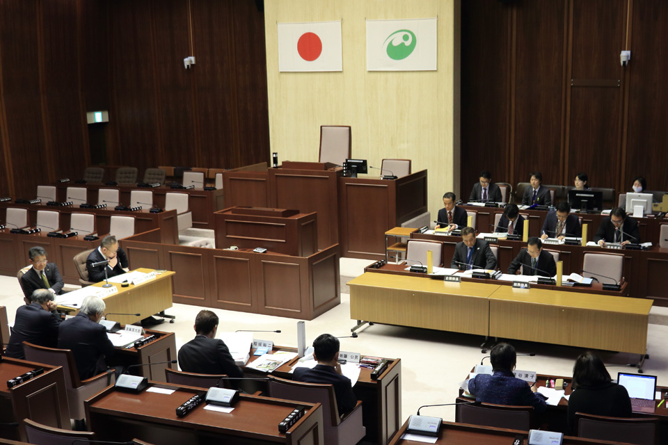 この日の審議は本会議場を使った。各委員会室が改装工事中のための臨時措置。委員は議員席の最前列に着席。市側はいわゆるひな壇に席を占めた。議席とひな壇の間のテーブルに委員長、副委員長が座った。