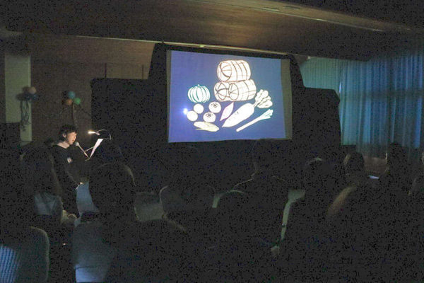 作品は「ふしぎな文房具屋」「木の葉の魚」の2点。2つのグループが、劇団スタジオライフ・倉本徹さんの影絵指導により制作し、安房直子倶楽部・横田千恵子さんの朗読にあわせて上演した。会場(視聴覚室)の入場者数46名。満席だった。