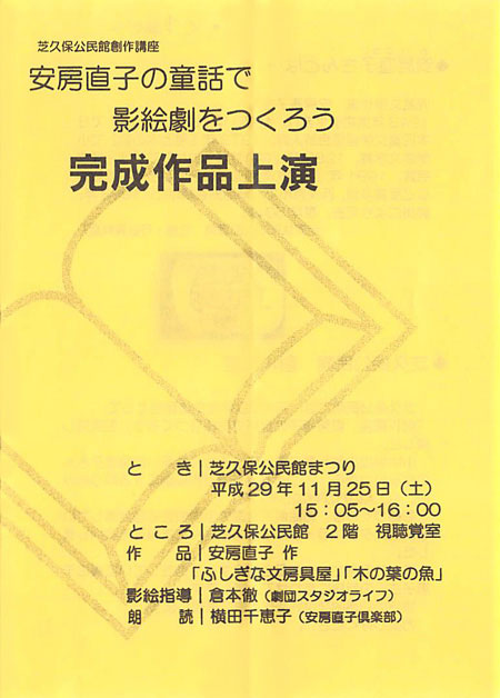 影絵劇上演会が[2017年]11月25日、芝久保公民館まつりの中であった。芝久保公民館主催講座「安房直子の童話で影絵劇をつくろう」での作品発表である。