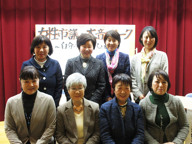 登壇したのは、大竹あつ子(共産)、加藤涼子(生活者ネット)、後藤優子(生活者ネット)、納田さおり(無所属)、藤田美智子(公明)、保谷清子(共産)、保谷七緒美(自民)(50音順)の市議7人。進行役は、市の男女平等参画推進委員会委員長で国際女性の地位協会理事の石崎節子さん。
