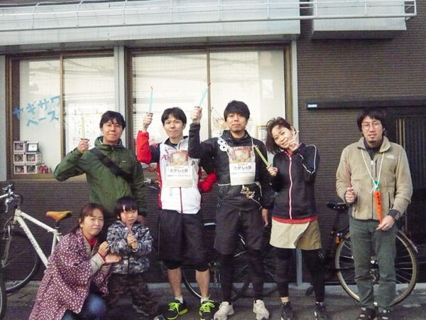 ゼッケンや襷を作り、駄菓子でできたトーチを取り出した。大人でも思わず掲げてみたくなる。「DAGASHIで世界を笑顔にする会」から送られた。9時30分。6人が自転車とランでヤギサワベースを出発した。