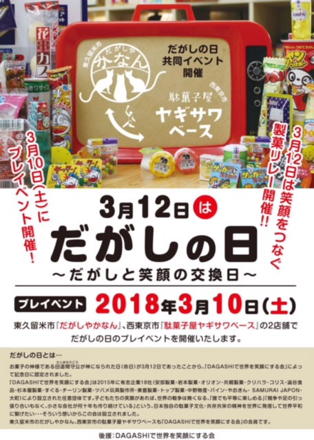 DAGASHIで世界を笑顔にする会によると、古事記などに出てくる田道間守公(たじまもりこう)は「お菓子の神さま」とも言われ、命日が3月12日だった。このため日本記念日協会の認定を受けて「だがしの日」を制定した。同会は2015年に製菓業者など有志企業18社が集まり、日本独自の駄菓子文化、共存共栄の精神を世界に発信して世界平和に繋げたいとの思いで設立したという。