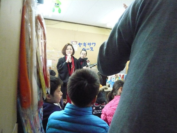 午後1時からは柳沢楽太郎一座によるライブ演奏と紙芝居。店内いっぱいの観客にむけて歌われたのは「駄菓子屋ブギウギ」と「梅の花ブルース」。2曲とも柳沢楽太郎一座によるオリジナル曲。ギターとボーカルがノリの良いジャズのサウンドを演奏すると本邦初演にもかかわらず、店内は手拍子と歌声。観客もまき込まれて思わず歌いだした。