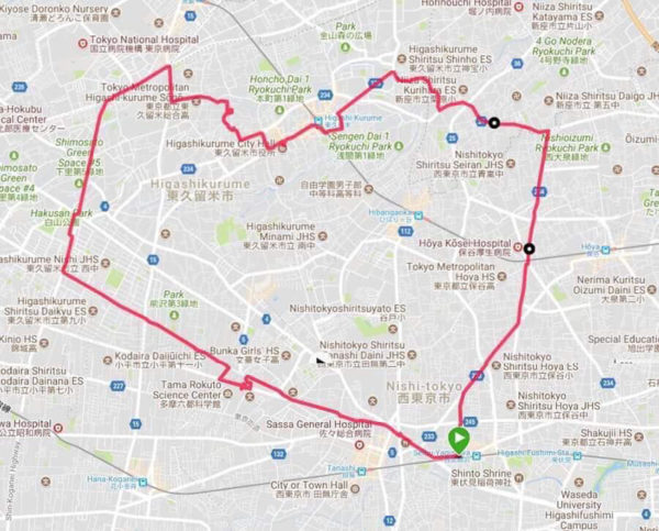西武新宿線西武柳沢駅にほど近いヤギサワベースから、滝山団地方面を巡り、東久留米市の北部、東部を経てヤギサワベースまで戻ってくるルート。途中、西東京市芝久保町のFM西東京に寄り、東久留米市幸町の「だがしやかなん」で小休止した。ここからは「かなん」チームもランに加わる。東久留米市役所では職員に歓迎と激励を受け、通りかかった小学校や保育園では子供達に「駄菓子の日」をアピールした。ヤギサワベースに戻ったのは12時30分。3時間にわたる製菓リレーは無事終了した。全長19km。その軌跡は「笑顔をつなぐ製菓リレー」を表現するハート型になった。