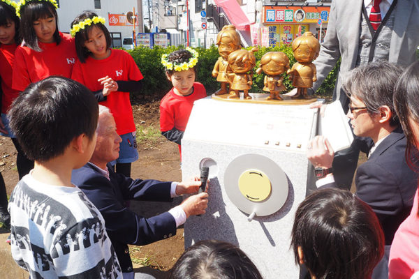 地元の地域型スポーツクラブ「ココスポ東伏見」で結成した子どもユニット「ココスポじょうもんず」などが、モニュメントの幕を外すと、下野谷村のしーたやのーやなど温かい家族の笑顔が現れた。