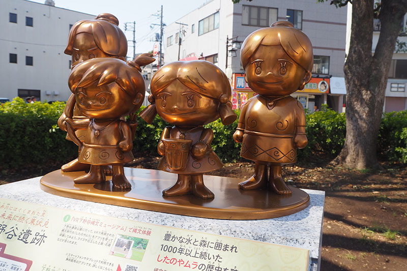 その他、南口駅階段下には、しーたが1基。ロータリー先、遺跡公園に向かう途中には、のーやが案内人の役を果たしている。また北口階段下には、しーたとのーや、土器のモニュメントが設置された。