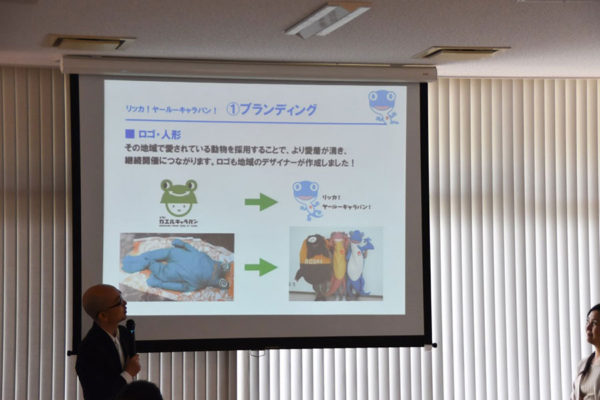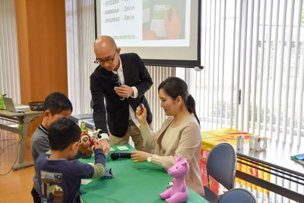 この日の勉強会は「イザ!カエルキャラバン!」の学習。協力団体のNPO法人プラスアーツの小倉丈佳さんが話してくれた。「神戸の震災の時は消防車も救急車もすぐには来られなかった。みんなが自分で動かないといけない。伝えたいことがたくさんあるのに、防災イベントというと人が来ない。ということで、あの手この手を考え、おもちゃの交換会と楽しくアレンジした防災プログラムを組み合わせました」「キャラクターの「カエル」とおもちゃを「トリカエル」から『いざ!カエルキャラバン』という名前です」