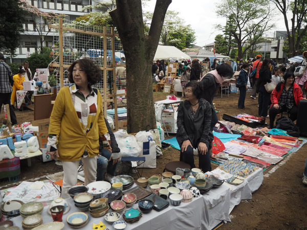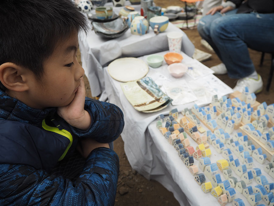 41もブースがあると、さすがに多彩だ。ペンダント、ネックレス、革製品、木の端切れを組み立てるてづくりカフェでは子どもが奮闘中。子供服やアジアの民芸品、大きなABCの文字など手づくり製品は工夫があっておもしろい。パン売り場やキッチンカー、インドネシア料理の店は、はやくも行列が並ぶ。仲間と一緒に陶器カップやお皿、陶器製の小さな家の置物を売っていた女性たちは「初めて参加した。にぎやかで、なんか楽しい」と話してくれた。ステージでは、アイリッシュギター、ジャズ、女性ボーカルの声と音が響き、演奏者も楽しんでいる。