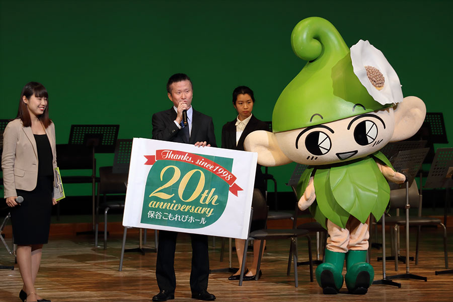 挨拶に立った丸山浩一市長は「このホールは市民の意見を聞きながらスタートしたと聞いています。この20年間シンフォニーや吹奏楽が聴けたり、ミュージカルや映画を楽ししめたり、多くの市民に親しまれてきた」と旧保谷市民の熱意が実って設立された経緯やその後の活動に触れたあと、「20万都市にふさわしい文化・芸術の発信拠点としてみなさんとともに育てていきたい」と述べた。