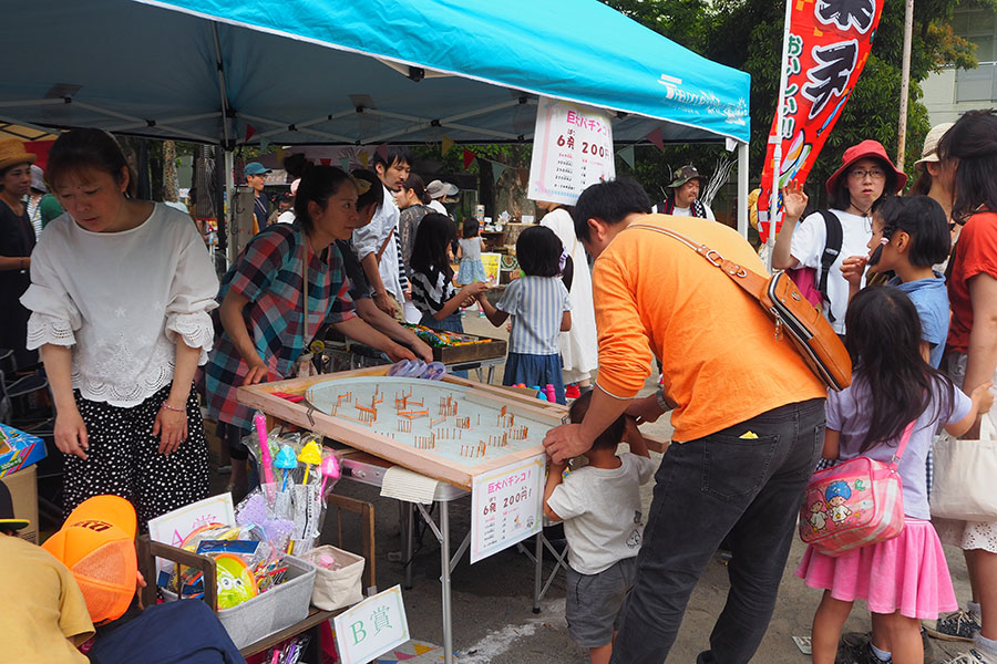 アクセサリーや通学グッズ、バッグ、装飾品などのハンドメイド雑貨を手に取る女性客が各店の前に溢れていた。また草木染の布を使ったうちわ作りに夢中になる子どもや、地元の駄菓子屋が出展した大きなパチンコ台の前で順番待ちする親子の列が目についた。