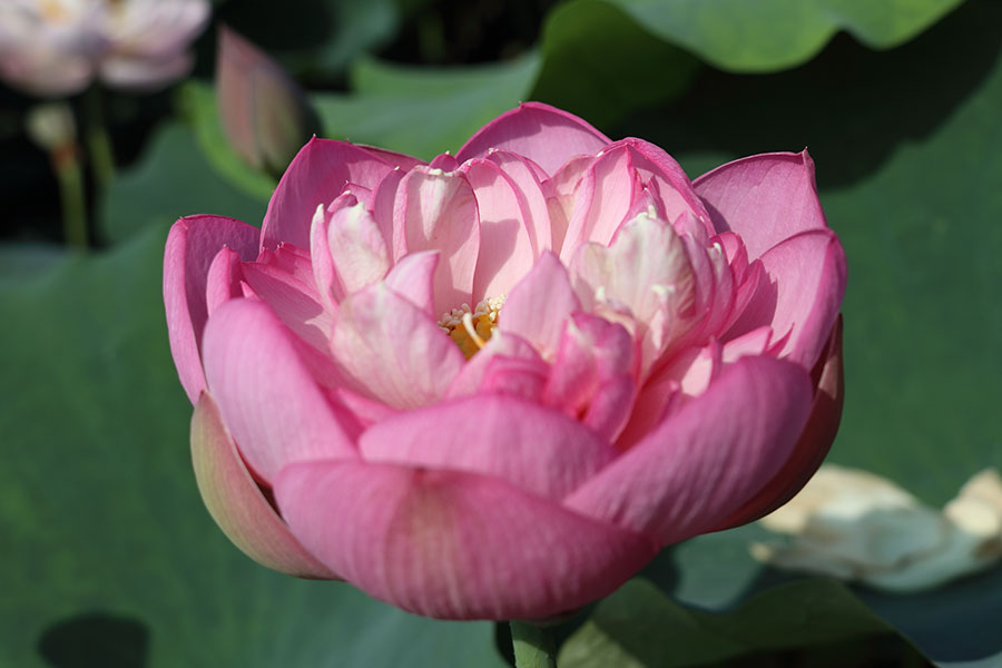 園内はカメラ持参の人が多い。人気の大賀蓮は花が散り、水を貯めたコンクリート製の区画の中は葉っぱだけが浮いている。「折角見に来たのに、とお叱りを受けるときがあります。大賀蓮は6月初めが見ごろ。いまは終わってしまいました。別の品種が咲いてますからそちらを見てください」と別のスタッフ。市内緑町在住の男性は「毎年来ていますよ。楽しみにしています」とカメラを抱えながら園内を歩いていた。